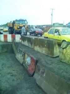 Seule une plaque de signalisation placée sur les lieux, informe les passants sur l’état actuel de la route. « Attention ! Route barrée travaux dangereux », peut-on lire dessus. Ce message, assez précis, n’empêche pas aux gros porteurs, transportant des billes de bois, bus d’agences de voyages, etc. de circuler et d’abimer d’avantage le pont.